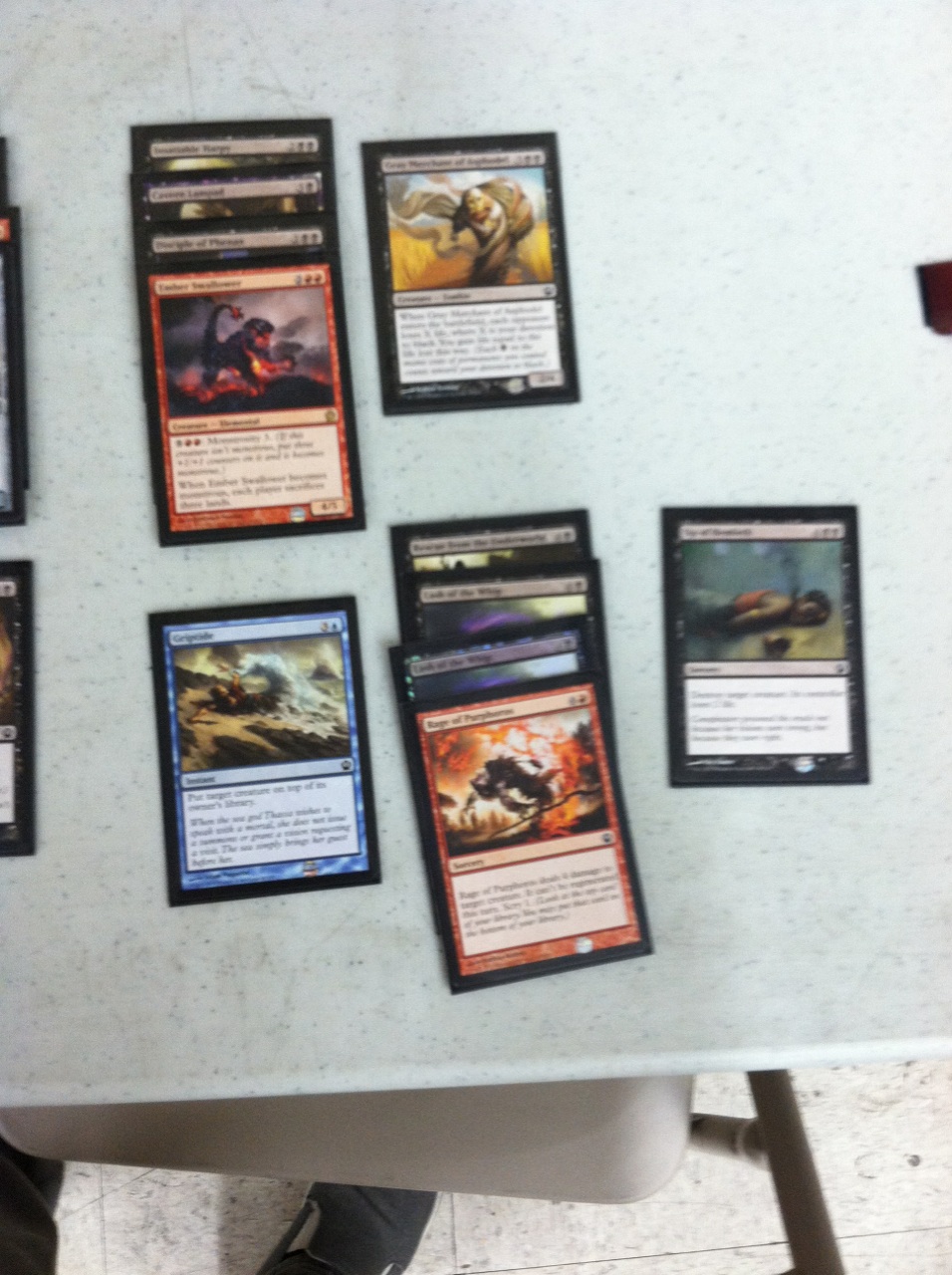 The way the deck played was interesting in the sense that I may not have had the most cohesive strategy. I was on the draw every game because I knew my deck wanted to draw and go late. Two plans of attack. 1) Stall and chip away at life totals until I had a substantial enough devotion count for my Gray Merchant to be awesome, or 2) “Ramp” into Ember Swallower’s monstrous and deny my opponent lands. In the draft my goal was the pull off the devotion deck but what ended up happening was that I wasn’t ever really in a position to finish off opponents with devotion (I also was never able to loop a Gray Merchant with a Rescue from the Underworld). The more successful games were where I used the second plan of attack listed above, or a combination thereof.