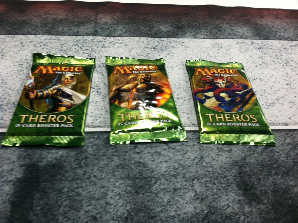 Yes, Theros is here. Well, in paper at least. Soon enough it will be online and all the ManaBluff glory will continue. For now, I’ve got a fun paper Magic post. Those were my draft packs on my awesome playmat. Unfortunately I did not open any of those cards whose images are pictured. But what I did open …